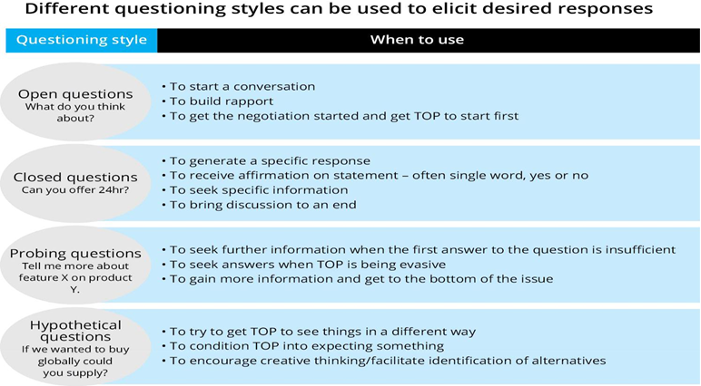 • In many negotiations, the side with the most information and insight is at an advantage and intelligent questioning is the best way to elicit information at all stages