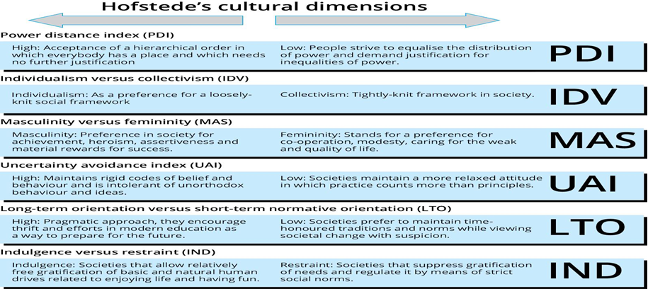 ❏ Professor Geert Hofstede initially classified national cultures against four dimensions, which were later expanded to six dimensions, as follows.